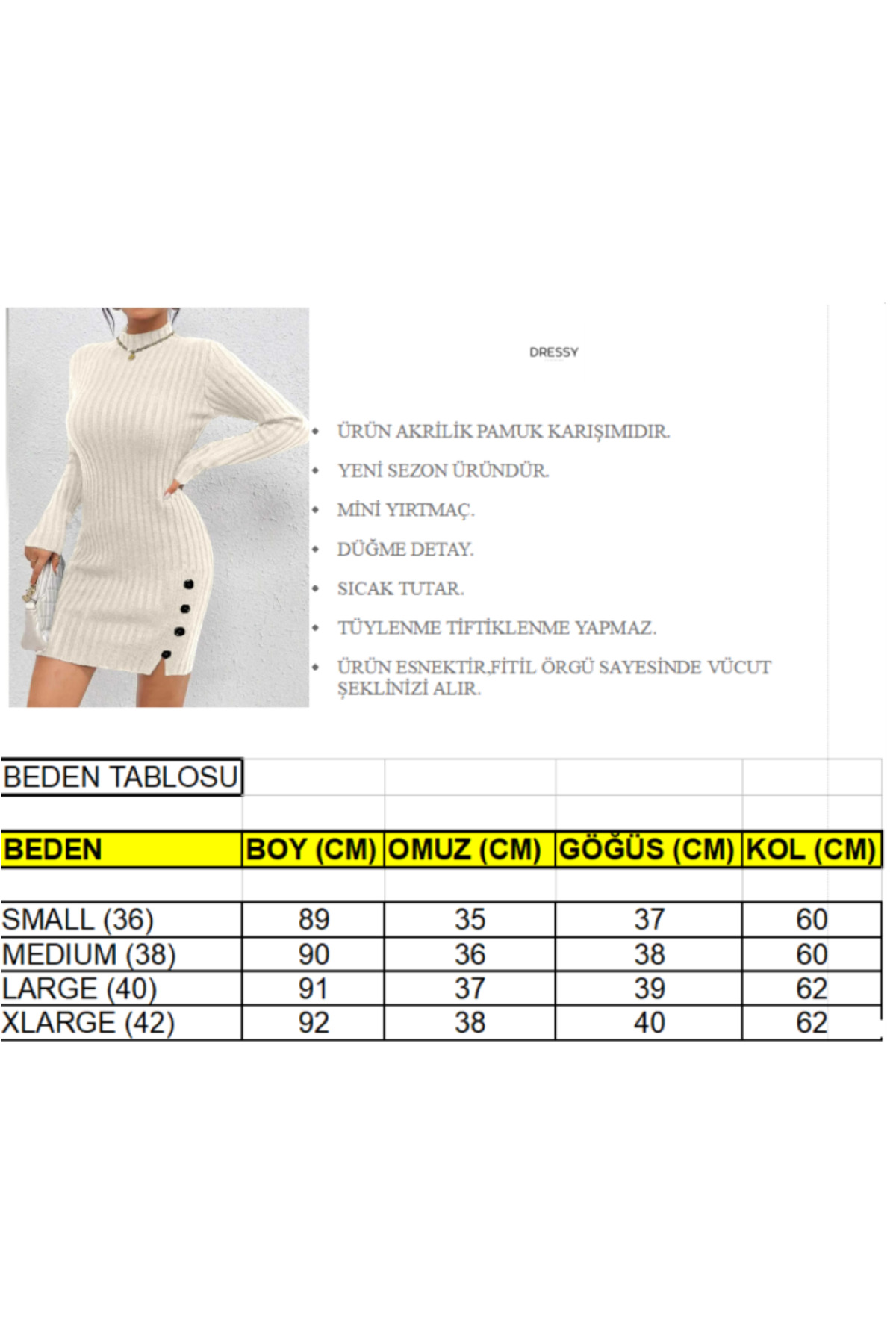 - Günlük kullanım için ideal, rahat ve şık tasarımıyla dikkat çeken hakim yaka fitilli model süs düğme detaylı yırtmaçlı rahat kalıp kadın triko elbise; - İç göstermeyen yapısı ile konforlu bir kullanım sunar ve her ortamda rahatlıkla tercih edilebilir; - Uzun kollu tasarımı sayesinde mevsim geçişlerinde de ideal bir seçenektir; - Tüm yaş gruplarına hitap eden geniş beden skalasıyla herkes için uygunluk sağlar; - Fitilli dokuma tipi, elbiseye modern ve dinamik bir görünüm kazandırırken, aynı zamanda zarif bir dokunuş sunar; - Mini boyu ile feminen ve genç bir siluet çizerken, dar kalıbı vücut hatlarını nazikçe sararak şık bir duruş sergiler; - Triko materyali sayesinde orta kalınlıkta bir konfor sunarken, günlük aktivitelerde rahat hareket etme olanağı tanır; - Düz deseniyle sadelikten yana olanların tercihi olup, kombin yapmayı kolaylaştırır.; - Basic koleksiyonun parçası olarak minimalist tarza sahip olan bu elbise, gardırob;