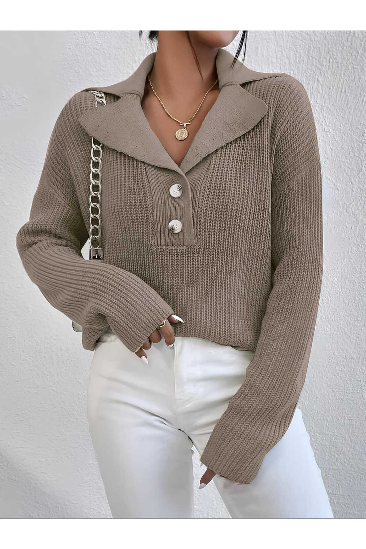Düğmeli Ceket Yaka Rahat Kalıp Kadın Triko Kazak Kahverengi