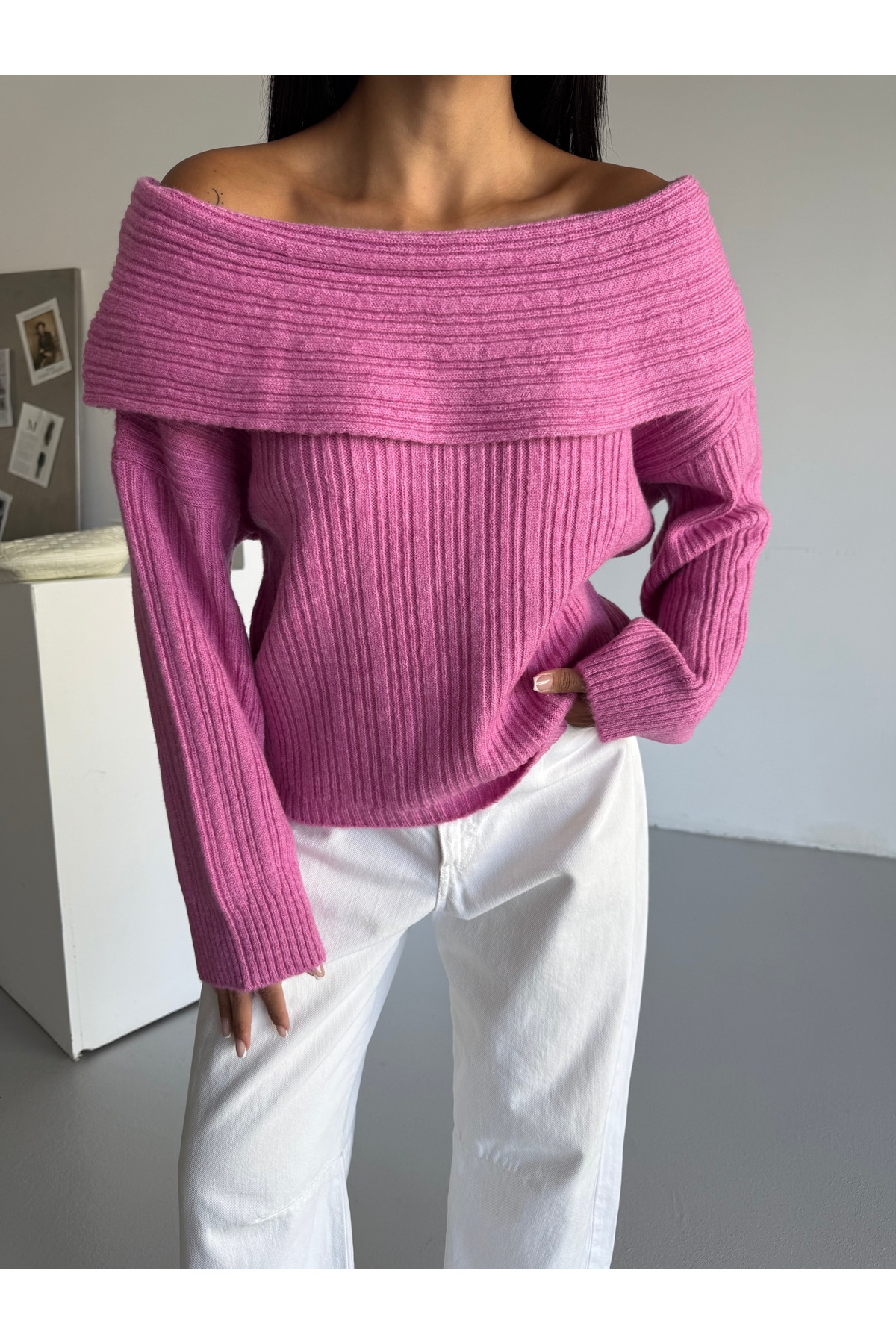Madonna Yaka Rahat Kalıp Şardonlu Özel İp Kadın Triko Kazak Pembe