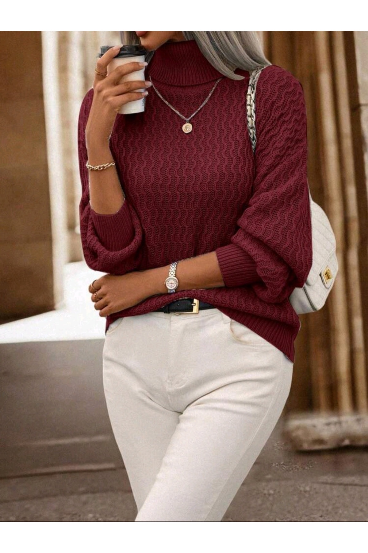Balıkçı Yaka Jakar Desen Rahat Kalıp Uzun Kol Kadın Triko Kazak Bordo