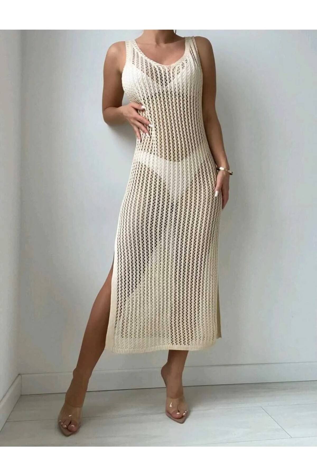 - Rahatlık ve şıklığı bir arada sunan kolsuz tasarımıyla yaz aylarının vazgeçilmezi.; - Yırtmaç detayı sayesinde hareket özgürlüğü sağlayarak plajda veya havuz kenarında rahatça hareket edebilirsiniz.; - 30 derecede yıkama imkanı ile kolay bakım avantajı sunar; böylece pareonuzu uzun süre ilk günkü gibi koruyabilirsiniz.; - 0 pamuk materyali ile cildiniz nefes alır ve gün boyu konforlu hissedersiniz.; - Derin V yaka kesimiyle feminen bir siluet oluştururken, ajurlu deseniyle modern bir görünüm kazandırır.; - Fitted kalıp sayesinde vücut hatlarınıza mükemmel uyum sağlar ve zarif bir duruş sergiler.; - Yetişkin yaş grubuna hitap eden bu pareo, plaj modasına uygun olarak tasarlanmıştır.; - Türkiye menşeli olmasıyla yerel üretim avantajını sunarken, uzun boy kesimiyle bacakları olduğundan daha uzun gösterir.; - Plaj tekstil koleksiyonunun parçası olarak hem şık hem de fonksiyonel bir aksesuar olarak gardrobunuzda yerini alır.