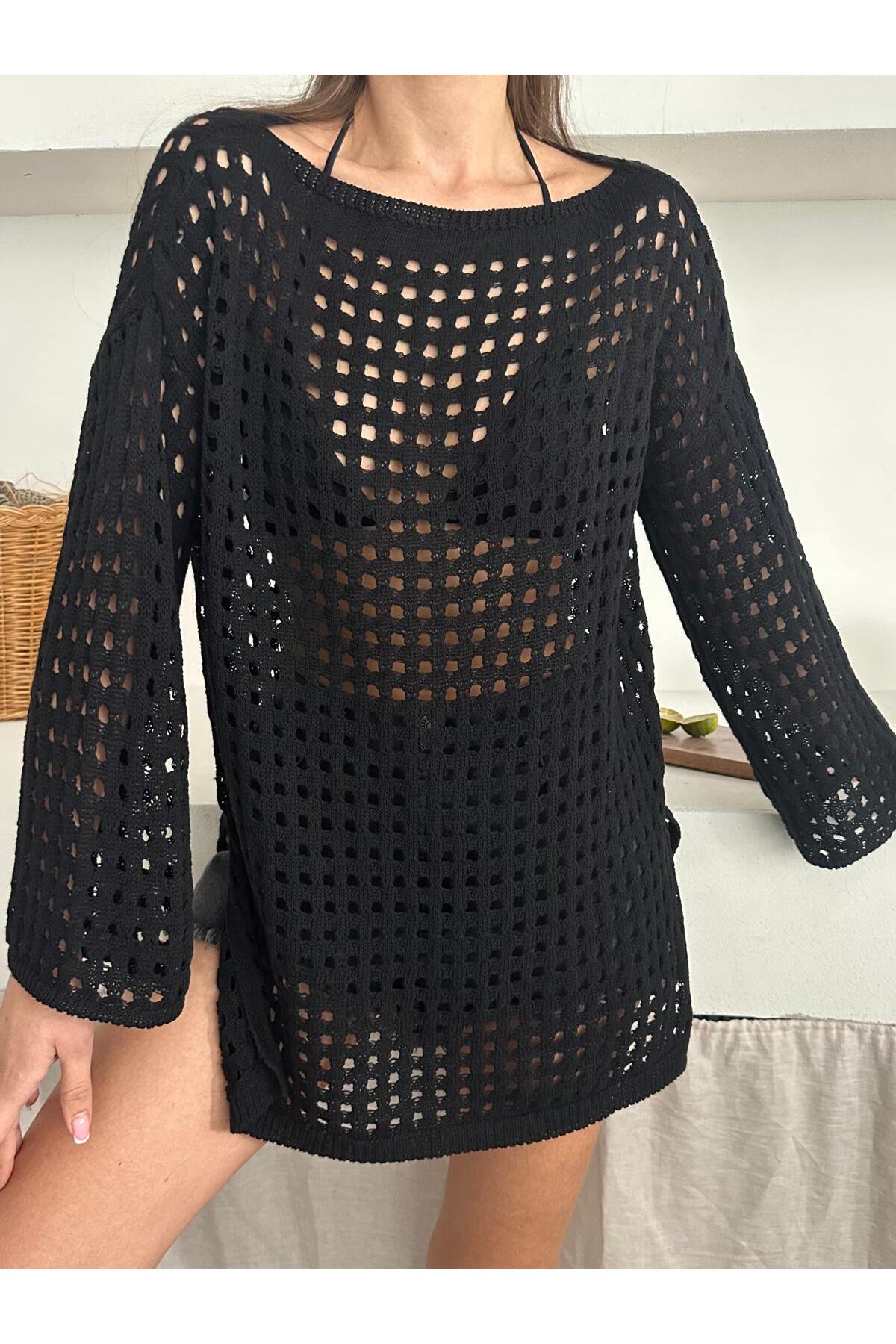 - Kayık yaka tasarımı ile feminen bir duruş sergilerken, ajurlu deseniyle yaz aylarında şıklığınızı tamamlar.; - Yırtmaç detayı sayesinde hareket özgürlüğü sunar ve rahat bir kullanım sağlar.; - Uzun kollu tasarımı ile mevsim geçişlerinde ideal konforu sunarken, basic silueti her türlü kombinle uyum sağlar.; - Cepsiz yapısı ile minimalist ve sade bir görünüm elde etmenize olanak tanır.; - Yaz sezonu için ideal olan bu tunik-bluz, beachwear ortamlarında rahatlıkla tercih edilebilir.; - Baskısız ve kemersiz tasarımıyla zamansız bir stil oluşturur; cool & comfort persona'nızı yansıtır.; - Triko görünümlü dokuma tipi ile yumuşak dokunuşu ve dayanıklılığı bir arada sunar.; - 0 pamuk materyali sayesinde nefes alabilirlik ve konfor sağlar; Türkiye'de üretilmiştir.; - Relaxed kalıbı ile rahat bir oturuş sunarken, regular boy kesimiyle farklı vücut tiplerine uyum sağlar.;