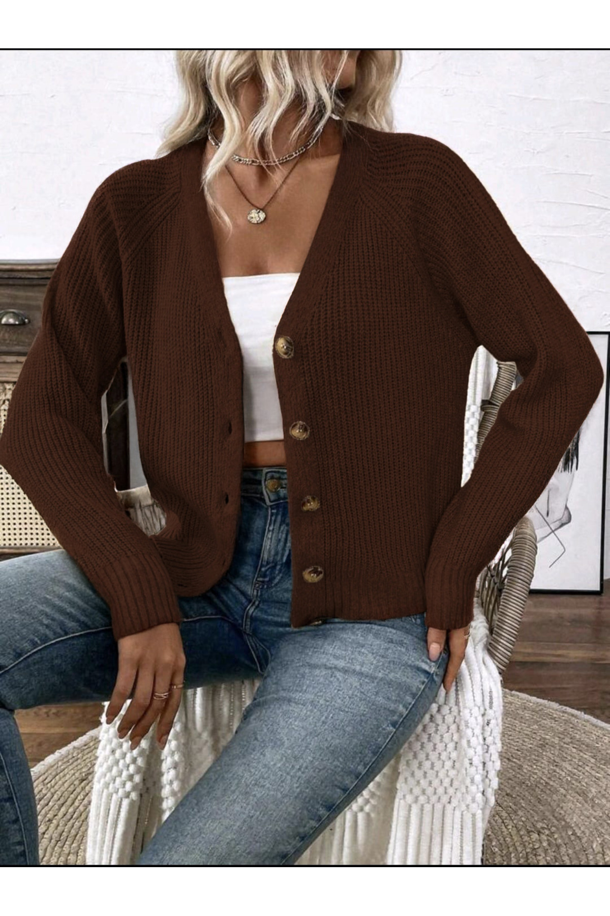 - Rahat kalıbı ve V yaka tasarımı ile günlük kullanım için ideal bir seçim.; - Düğmeli detayları, şıklığı ve fonksiyonelliği bir arada sunar.; - Düz deseniyle sade ve zamansız bir görünüm sağlar.; - Uzun kollu tasarımı, kış aylarında sıcak tutarken rahat hareket etme özgürlüğü verir.; - Pamuk ve akrilik karışımı materyali, yumuşak dokusuyla konforlu bir deneyim sunar.; - Tüylenme yapmayan kumaşı sayesinde uzun süreli kullanım için idealdir.; - Relaxed kalıbı ile vücut hatlarını sarmayan, özgürce hareket etme imkanı tanır.; - Örgü dokuma tipi, triko kumaşın dayanıklılığını ve estetiğini ön plana çıkarır.; - Cepsiz tasarımıyla minimalist ve modern bir stil oluşturur.; - Standart boyu her bedene uyum sağlayarak kolayca kombinlenebilir.; - Türkiye'de üretilmiş olmasıyla yerel üretim desteklenmiş olur.;