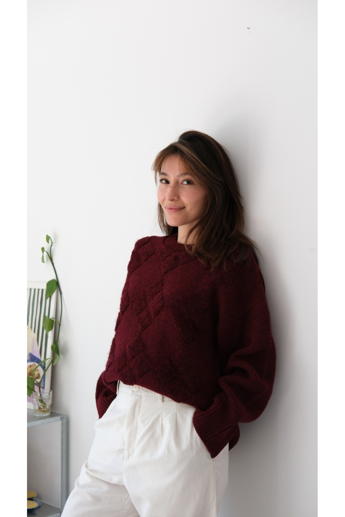 - Yumuşacık dokusuyla ekstra konfor sunan Kazak, soğuk kış günlerinde sizi sıcak tutar.; - Günlük kullanım için ideal olan bu triko kazak, rahatlığı ve şıklığı bir arada sunar.; - Uzun kollu tasarımı ile kollarınızı soğuktan korurken, baklava deseniyle stilinizi öne çıkarır.; - Baskısız tasarımıyla sade ve zamansız bir görünüm kazandırırken, kemersiz yapısıyla rahat hareket etme olanağı tanır.; - Tek parça olarak gelen bu ürün, gardırobunuzdaki temel parçalardan biri olacak.; - Oversize kalıbı ile modern ve rahat bir siluet çizerken, bisiklet yaka detayı ile feminen bir dokunuş katıyor.; - Yetişkin kadınlar için tasarlanmış standart boyuyla her vücut tipine uyum sağlar.; - TR menşei garantisiyle yerli üretim kalitesini deneyimleyin.;