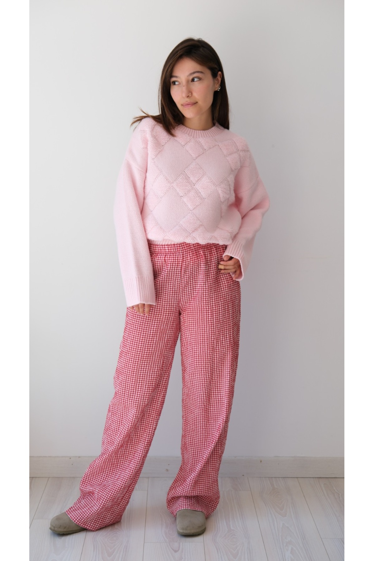 - Yumuşacık dokusuyla ekstra konfor sunan Kazak, soğuk kış günlerinde sizi sıcak tutar.; - Günlük kullanım için ideal olan bu triko kazak, rahatlığı ve şıklığı bir arada sunar.; - Uzun kollu tasarımı ile kollarınızı soğuktan korurken, baklava deseniyle stilinizi öne çıkarır.; - Baskısız tasarımıyla sade ve zamansız bir görünüm kazandırırken, kemersiz yapısıyla rahat hareket etme olanağı tanır.; - Tek parça olarak gelen bu ürün, gardırobunuzdaki temel parçalardan biri olacak.; - Oversize kalıbı ile modern ve rahat bir siluet çizerken, bisiklet yaka detayı ile feminen bir dokunuş katıyor.; - Yetişkin kadınlar için tasarlanmış standart boyuyla her vücut tipine uyum sağlar.; - TR menşei garantisiyle yerli üretim kalitesini deneyimleyin.;